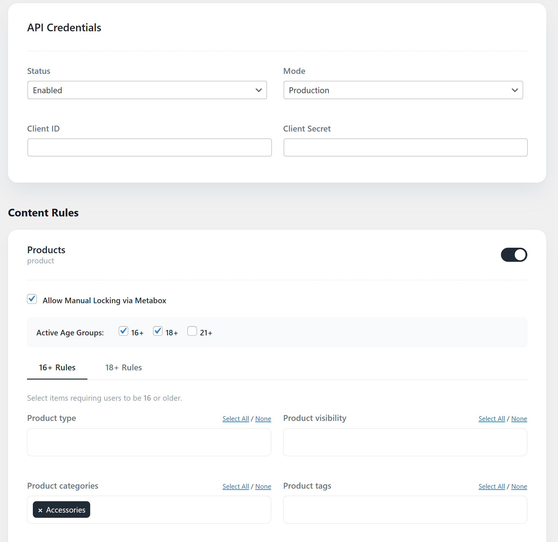 AgeOnce Settings – API credentials and content rules