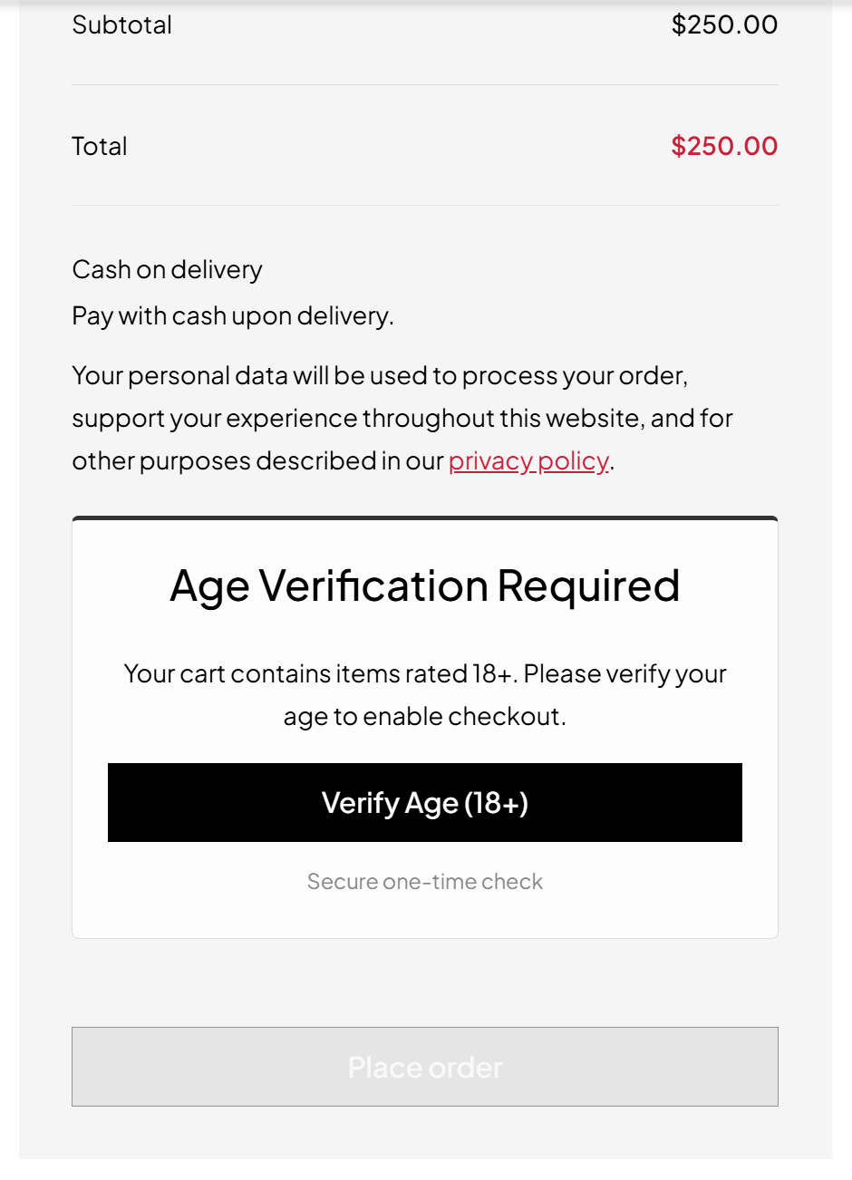 Checkout age gate – verification required before placing order