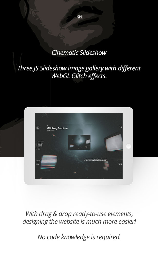Three.JS Slideshow image gallery with different WebGL Glitch effects.