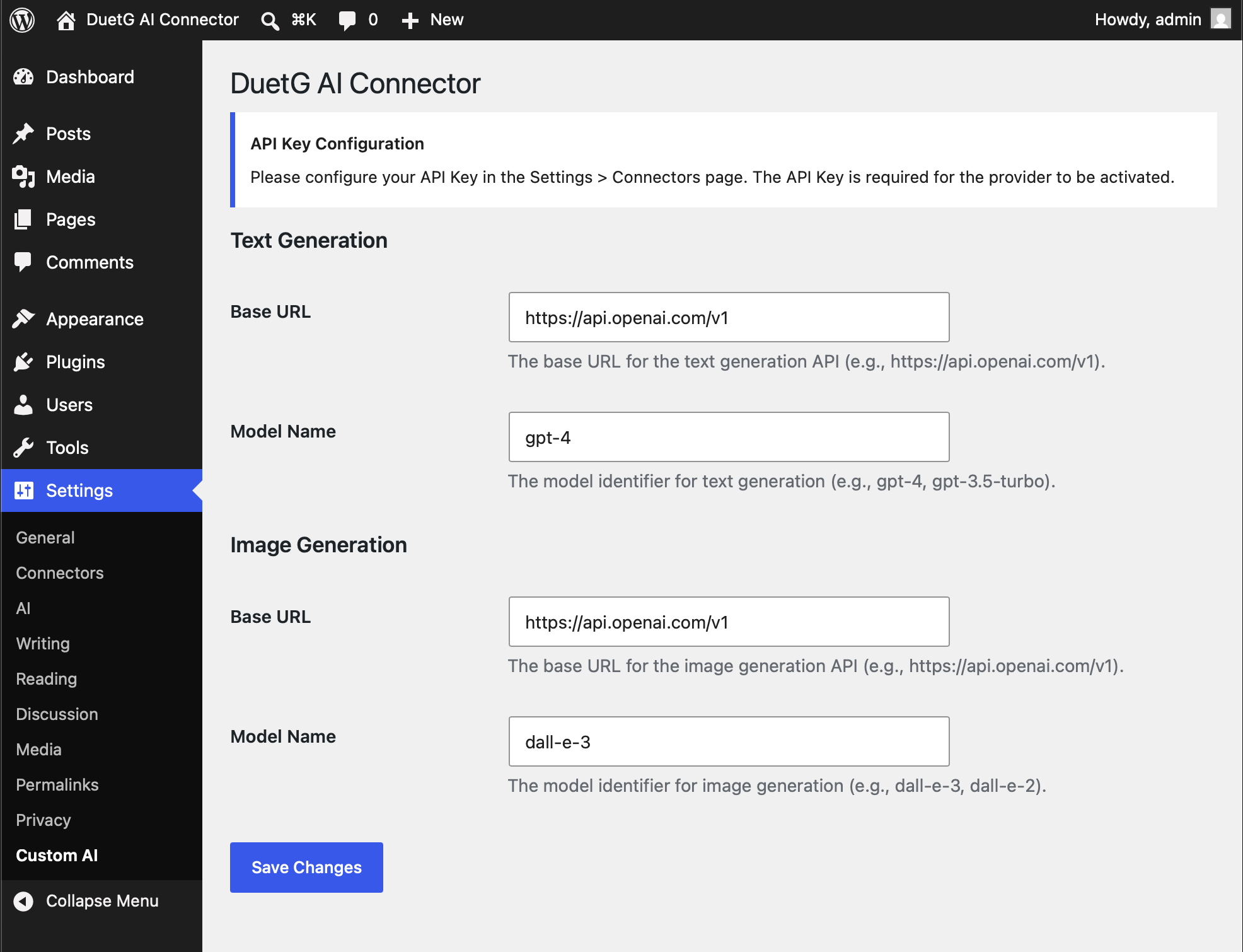 DuetG AI Connector allows WordPress AI Client to connect to any AI service that provides an OpenAI-compatible API, such as: