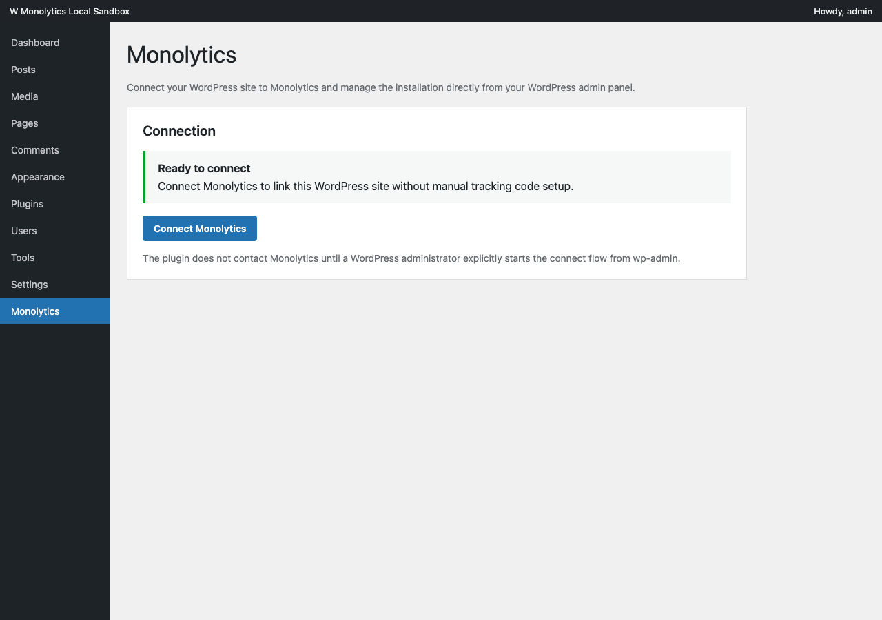 The plugin does not contact Monolytics until a WordPress administrator explicitly starts the connect flow from wp-admin.