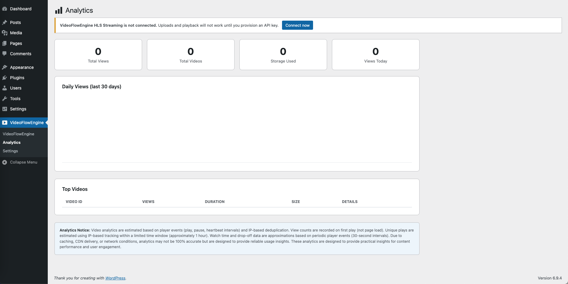 - Go to VideoFlowEngine Settings and click “Connect to VideoFlowEngine” to provision a free API key (you will be shown exactly what data is sent before connecting)